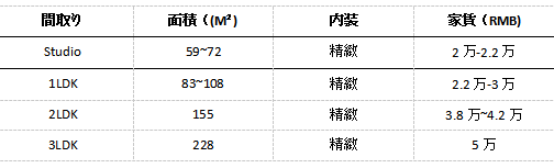 ・ 税金、物業管理費、インターネット、光熱費(10元㎡/月)込み込み;